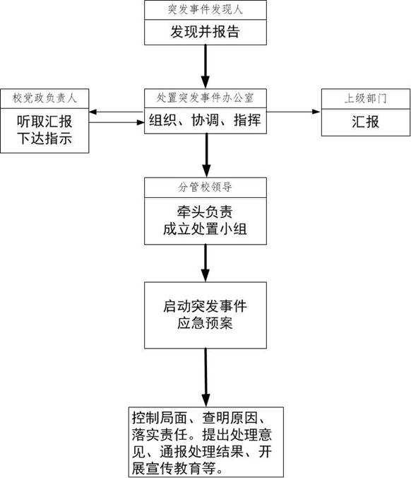 领导小组下设处置突发事件办公室,办公室设在院长办公室,学校分管安全工作的领导兼任处置突发事件办公室主任。