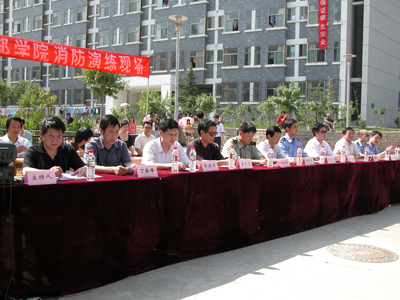 下午3时整,消防疏散演习正式开始。按照学院处置火灾灭火应急工作预案的要求,本次活动成立了“消防灭火组织指挥演习领导小组”,负责对此次消防疏散演练现场的领导、组织和实施,并成立了灭火作战组、抢救疏散组、安全保卫组等三个工作小组。本次演习分为三个阶段:第一阶段发现火情,组织疏散、报警;第二阶段灭火与自救;第三阶段消防演示。主要内容包括:宿舍发生火灾后,值班人员进行火情确认、组织疏散和正确报警;宿舍火场的逃生与自救;基本灭火器材讲解与演示等。学院领导,消防历城大队、港沟派出所领导,学院各部门负责人、消防员、治安员、各教学系学生会干部、超市餐厅安全负责人、物业公司安全员等共计1000余人参加了此次活动。