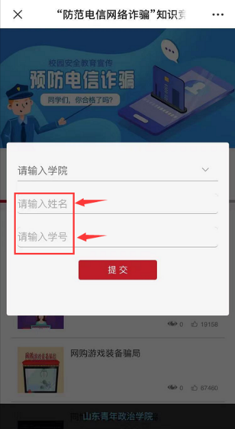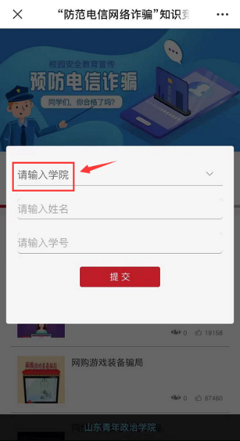 3. 在“请输入学院”位置,自己输入所在学院;在“请输入姓名”位置,输入个人姓名;在“请输入学号”位置,输入个人学号。