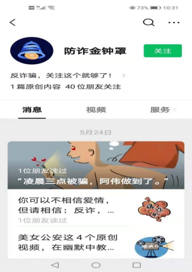 5.提前预警,收获专属防骗知识。根据不同年龄、职业等人群特点,测试被骗风险指数,并对风险行为预警及提示,防患未然,推送最新的诈骗案例,提升防骗能力。